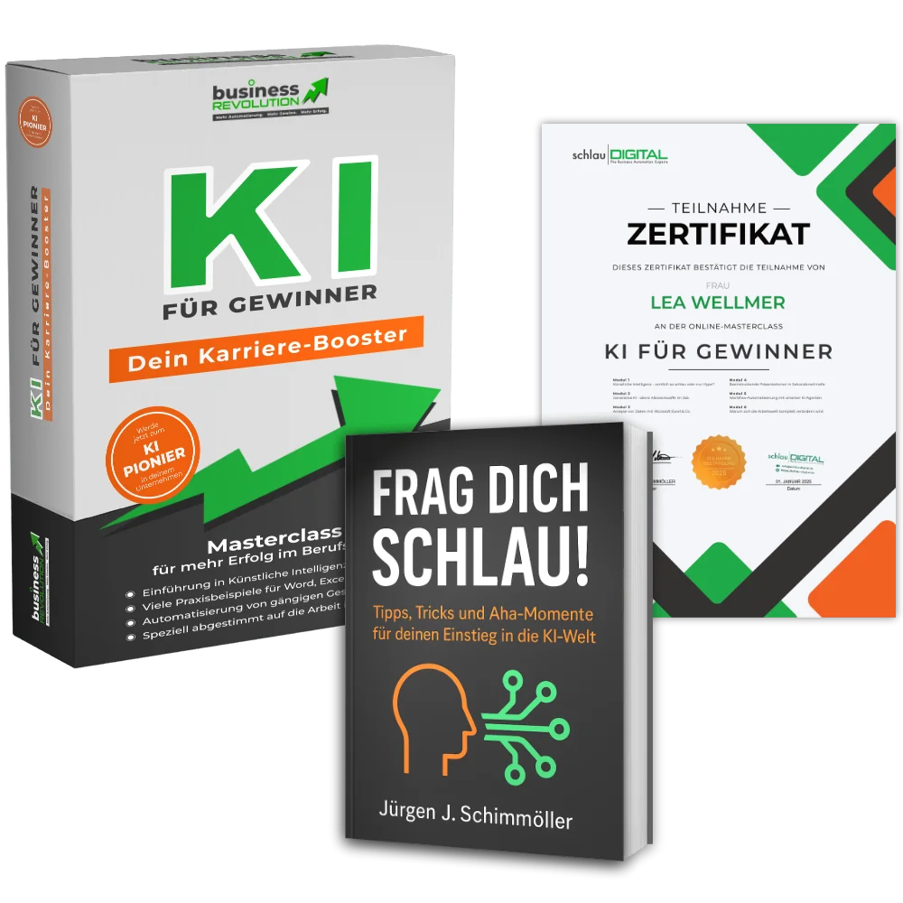 Sobald du alle 6 Module der Masterclass "KI für Gewinner" durchgearbeitet und die zugehörigen Prüfungsfragen komplett beantwortet hast, erhältst du das auf deinen Namen ausgestellte Zertifikat per E-Mail zugeschickt.